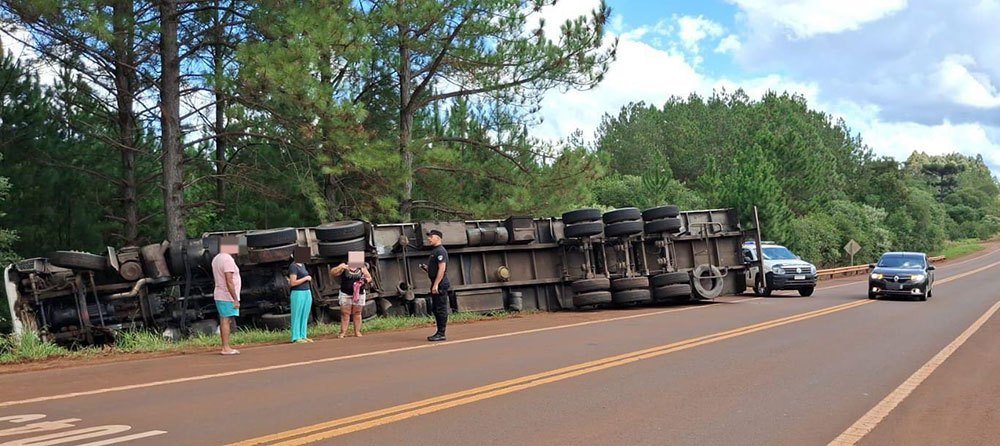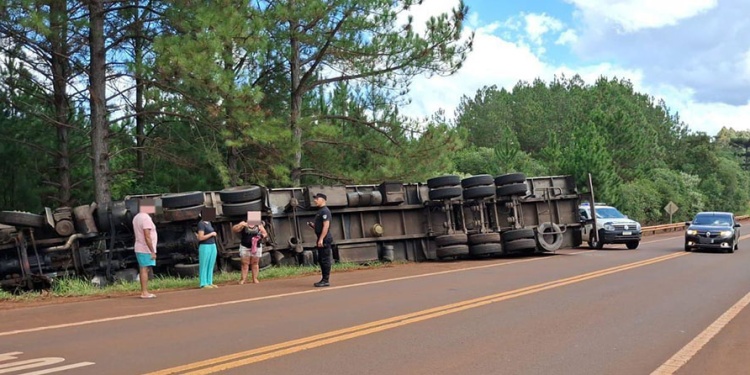 Un camión con acoplado despistó y volcó este sábado sobre la ruta nacional 14, a la altura del kilómetro 1045, en jurisdicción de San Pedro, sin que se registraran personas lesionadas.