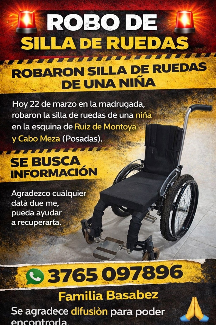El robo de la silla de ruedas de una niña de 12 años con cuadriplejia generó indignación y motivó un pedido de colaboración a la comunidad para poder recuperarla. El hecho ocurrió durante la madrugada del 22 de marzo en la esquina de Ruiz de Montoya y Cabo Meza, en la chacra 179 de la capital misionera.