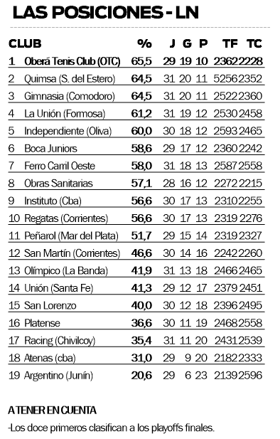 Oberá Tenis Club (OTC) tendrá una parada de cuidado esta noche cuando reciba a Boca Juniors, en un duelo en el que buscará quedarse con una victoria para mantenerse en la primera posición de la tabla de la Liga Nacional de Básquetbol (LNB).