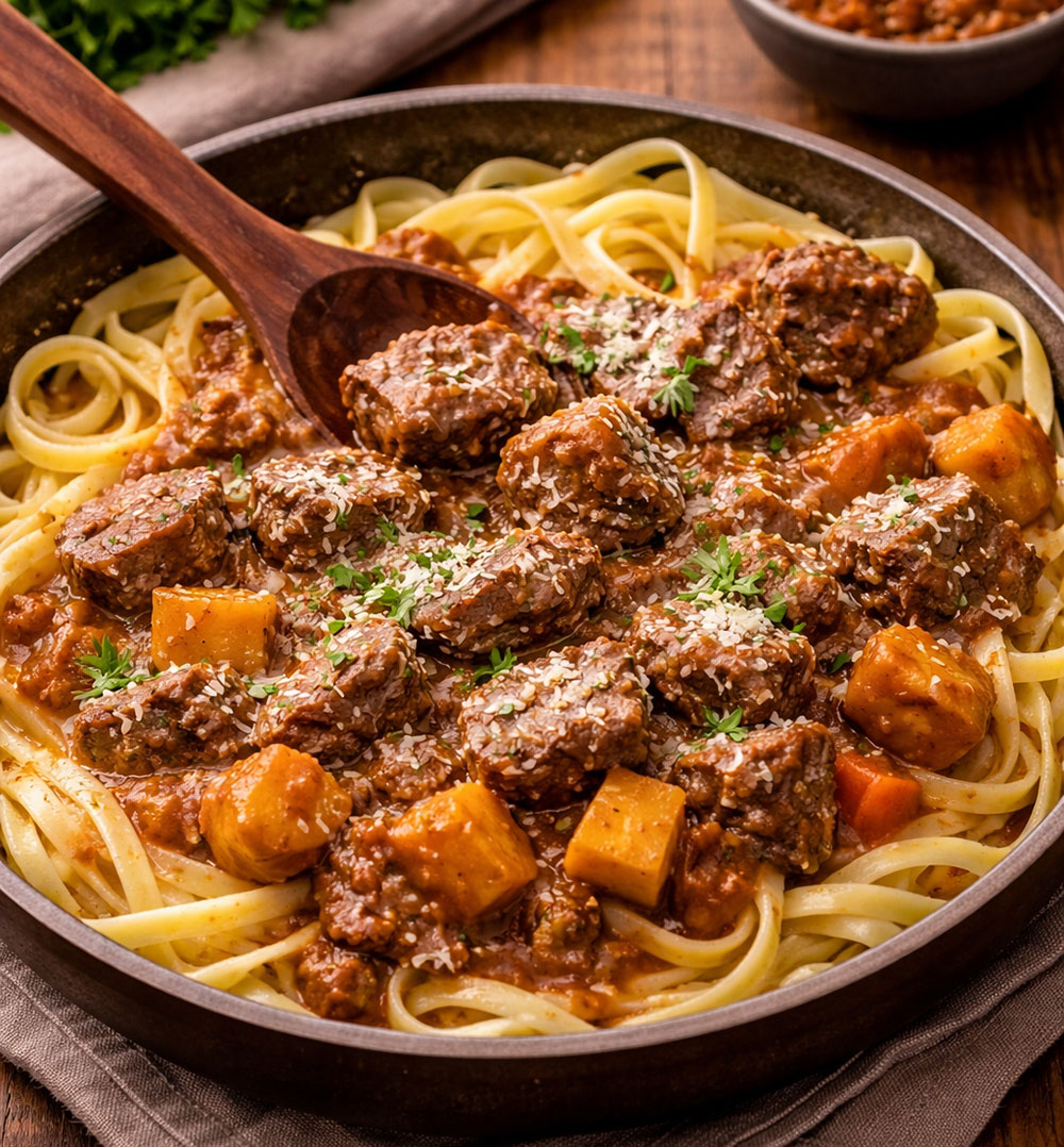 Cocinar los fetuccini y terminarlos dentro del estofado. Ahí absorben todo el sabor.