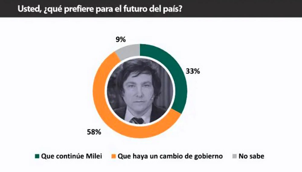 En ese marco, la encuesta de Innova mostró otro dato muy delicado para el Gobierno en medio del frente de tormenta que se formó: al preguntar “qué prefiere para el futuro del país” el 33% dijo que quiere que “continúe Milei” y el 58% respondió “que haya un cambio de Gobierno”.