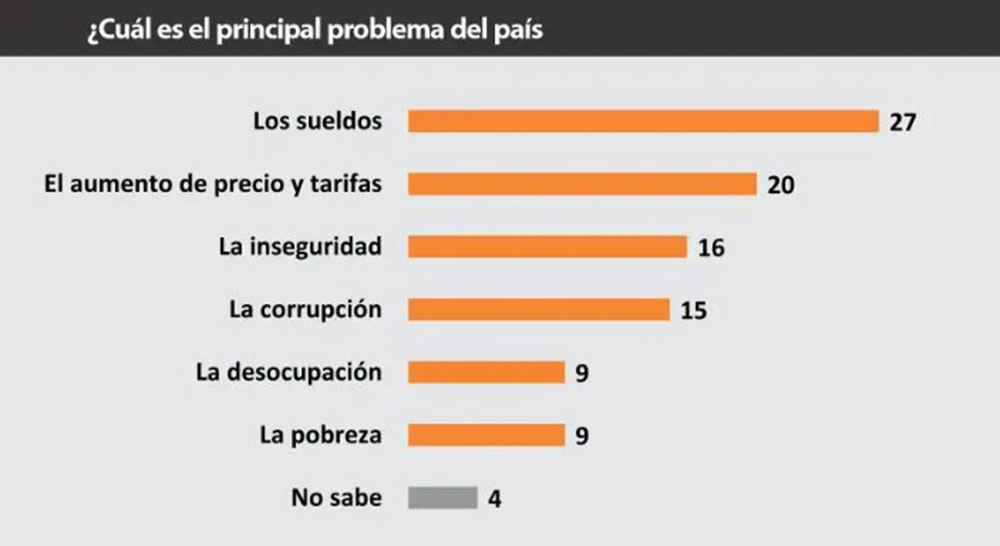 En el primer lugar apareció como problema “los sueldos” con 27% de las respuestas, seguido por “el aumento de precios y tarifas” con el 20%. En tercer puesto quedó la “inseguridad” con 16%.