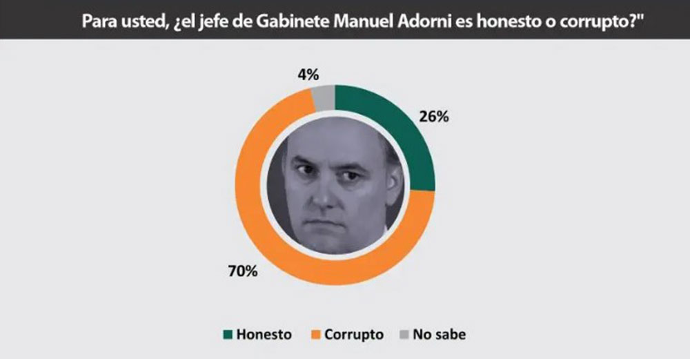 No obstante, al indagar puntualmente en el caso de Adorni, la encuesta realizada por Innova entre el 16 y el 19 de marzo con 1.830 casos efectivos arrojó un resultado lapidario: el 70% consideró que es “corrupto” y solo el 26% lo calificó como “honesto”.