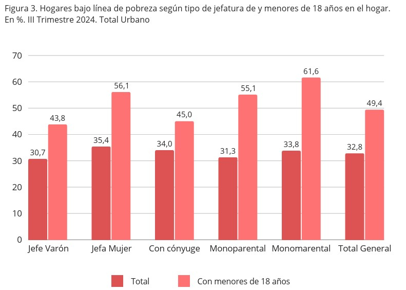 La vulnerabilidad se agudiza en los hogares monomarentales, donde el 60% se encuentra bajo la línea de pobreza, la misma proporción que afecta a las trabajadoras de casas particulares.