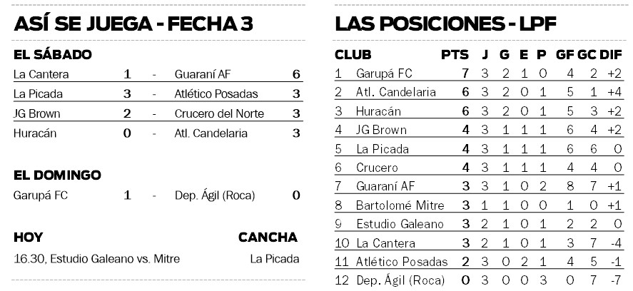 Recordemos que este capítulo se puso en marcha el fin de semana, donde se dieron los siguientes resultados: La Cantera 1 – Guaraní 6, La Picada 3 – Atlético Posadas 3, Brown 2 – Crucero del Norte 3, Huracán 0 – Candelaria 3 y Garupá 1 – Deportivo Ágil 0.
