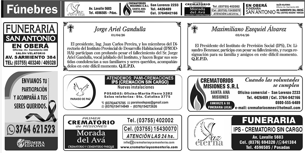 Fúnebres del sábado 4 de abril de 2026