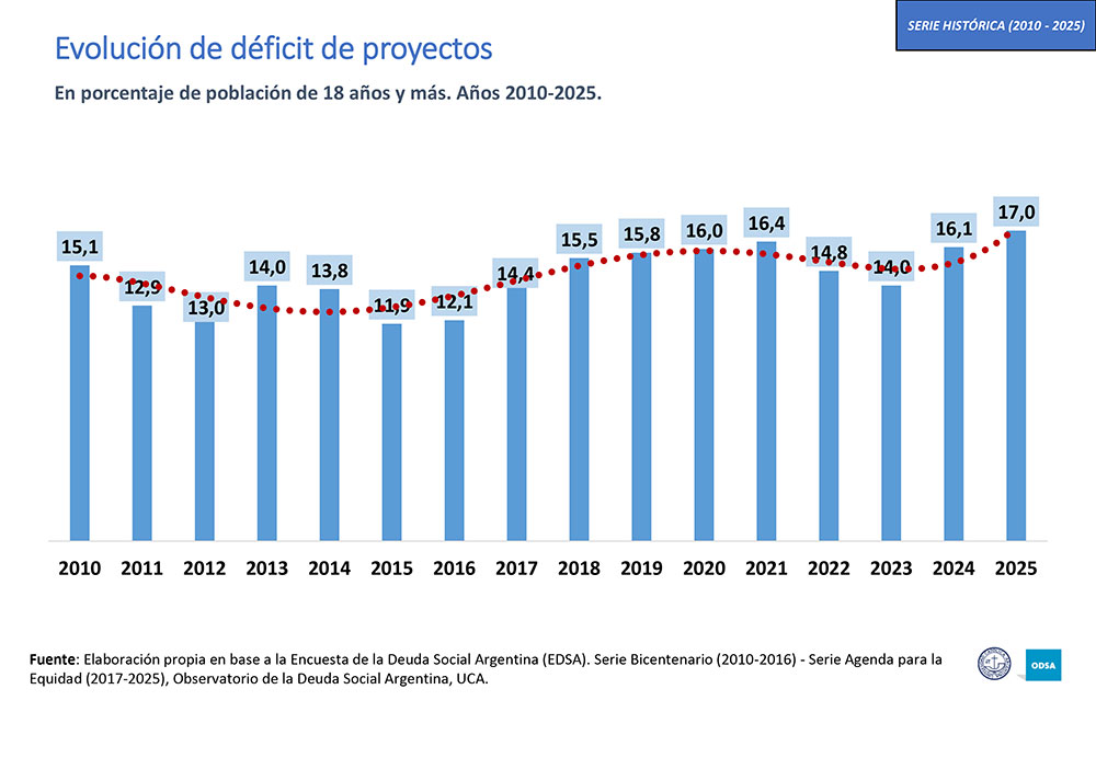 Definido como la percepción de no tener proyectos en la vida, este indicador no mide apatía; mide la pérdida del horizonte vital. En 2025, el 16,2% de las mujeres reportó déficit de proyectos, frente al 12,6% de los varones. Pero en las jefas monoparentales, la cifra se duplica en ciertos contextos: entre las de estrato socio-ocupacional bajo marginal, alcanza el 23,0%; entre las desempleadas, el 44,2%. La precariedad laboral y la pobreza no solo limitan el presente; cancelan el futuro.