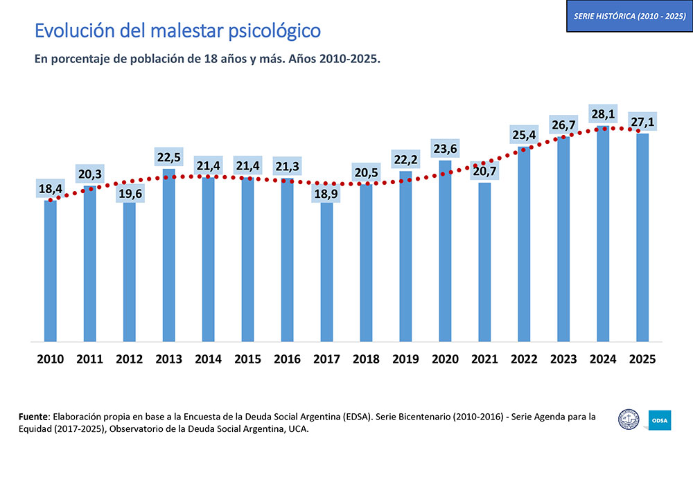 Este no es un caso aislado. Es la cara doméstica de una curva que el Observatorio de la Deuda Social Argentina lleva midiendo, año tras año, desde 2010. Y esa curva, lejos de ser un accidente coyuntural, revela un deterioro crónico, estructural y profundamente genderizado de la vida psicosocial en Argentina.
