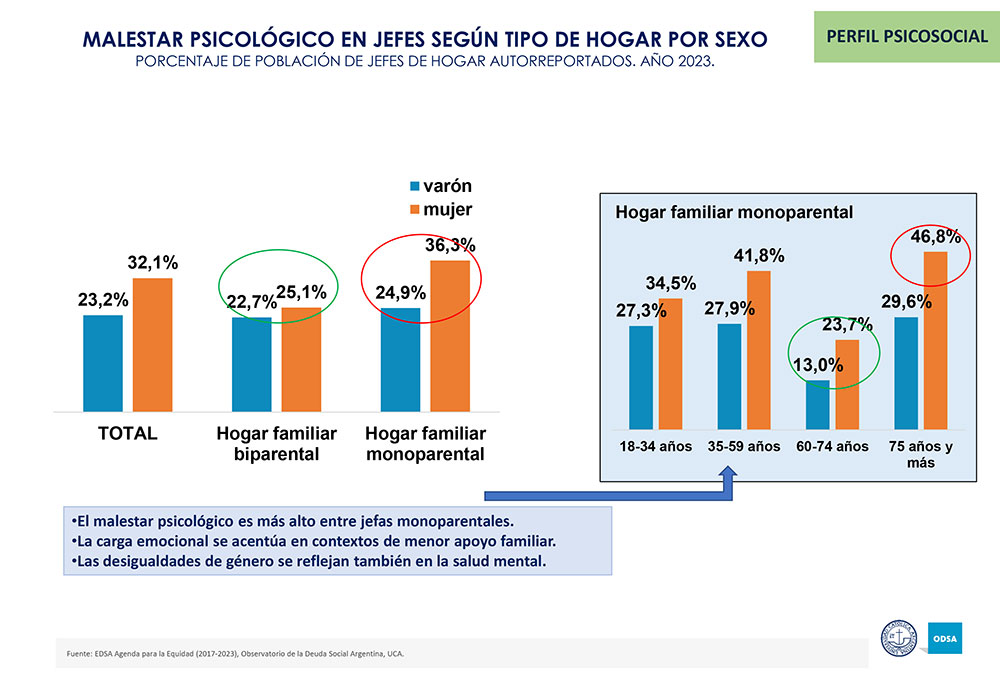 En 2023, el malestar psicológico en jefes de hogar alcanza el 36,3% en mujeres frente al 23,2% en varones. La brecha se dispara al cruzar con la estructura familiar: en hogares monoparentales, trepa al 32,1% en jefas (vs. 25,1% en varones). No es una coincidencia demográfica; es la huella de un sistema que externaliza los cuidados en las mujeres, incluso cuando están solas al frente.