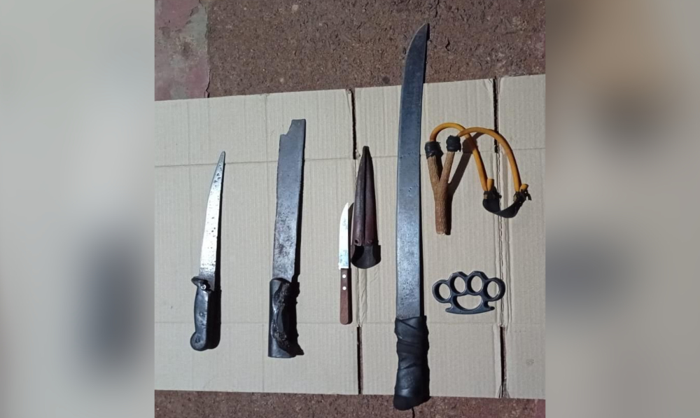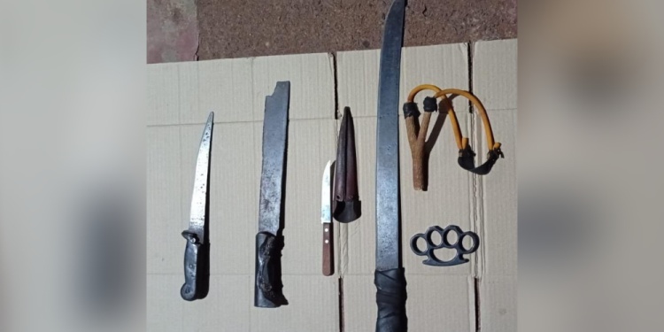Durante el procedimiento, los policías secuestraron un machete con empuñadura de goma negra, un machete recortado, un cuchillo tipo puñal, un cuchillo tipo serrucho, una manopla metálica y una gomera, elementos que se encontraban en poder de los involucrados.