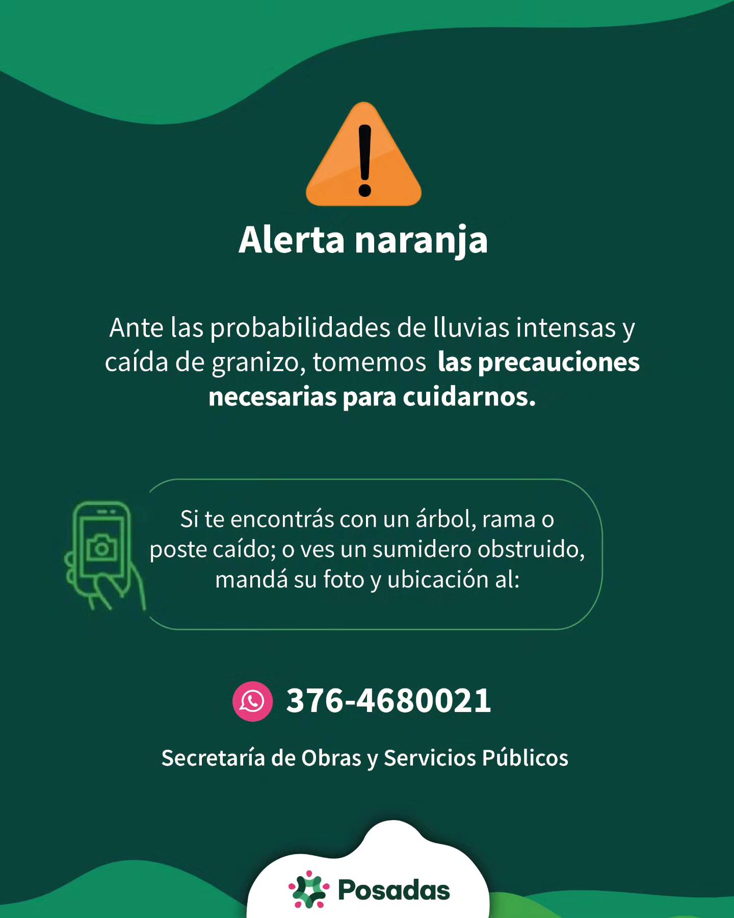 “Estamos con la advertencia naranja a partir de este momento para la ciudad de Posadas, a partir de la tarde noche de hoy, hasta mañana al mediodía aproximadamente”, señaló el especialista, al describir el escenario previsto para las próximas horas. Según explicó, en ese lapso “se van a producir áreas de lluvias y tormentas ocasionalmente fuertes”, lo que implica la posibilidad de “períodos de lluvia intensa, caída aislada de granizo, fuertes ráfagas de viento y también caída de rayos”.
