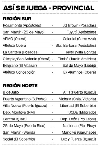 Por su parte, la Región Norte no se quedará atrás y pondrá en marcha sus sueños con los enfrentamientos entre 9 de Julio y ATTI de Iguazú, Puerto Argentino de San Pedro ante Victoria de Colonia Victoria, Villa Nueva de Puerto Iguazú frente a Libertad de El Soberbio, Deportivo Montoya de Ruiz de Montoya ante Unión Cultural de Eldorado, Central Iguazú contra Atlético León de Puerto Leoni, 25 de Mayo de Puerto Rico frente a Nacional de Puerto Piray, San Martín de Wanda ante Mandiyú de Garuhapé y Social de El Soberbio contra Luz y Fuerza de Iguazú.