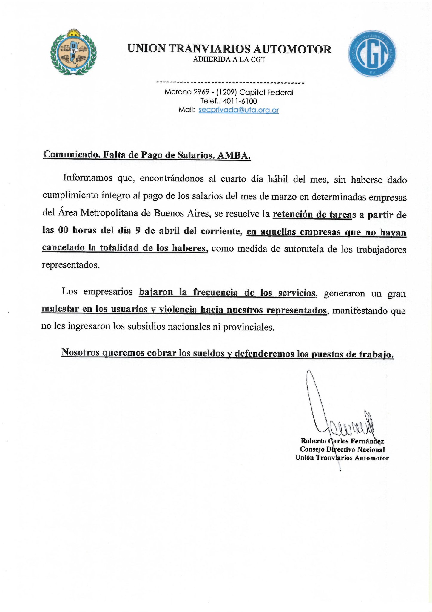 En un comunicado, la UTA sostuvo que la retención de tareas se aplicará “en aquellas empresas que no hayan cancelado la totalidad de los haberes”, al considerar que no se cumplió con el pago íntegro dentro del plazo correspondiente.