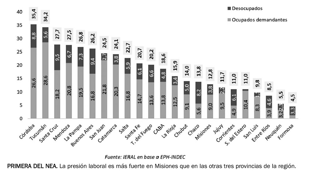 En el plano regional, los datos muestran que Misiones se ubica en un nivel intermedio de presión laboral, con un 12,8% de la población económicamente activa afectada por la combinación de desocupación y búsqueda de más trabajo.