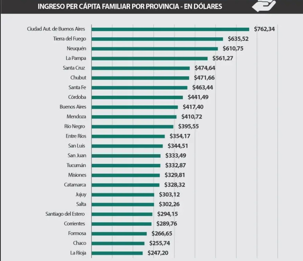 El contraste también se observa frente a otras regiones del país. Las provincias patagónicas presentan niveles de ingresos mucho más altos: Tierra del Fuego alcanza los US$ 635,52, Neuquén los US$ 610,75 y La Pampa los US$ 561,27. Esto refuerza la idea de una Argentina fragmentada, donde las oportunidades económicas varían drásticamente según la geografía.