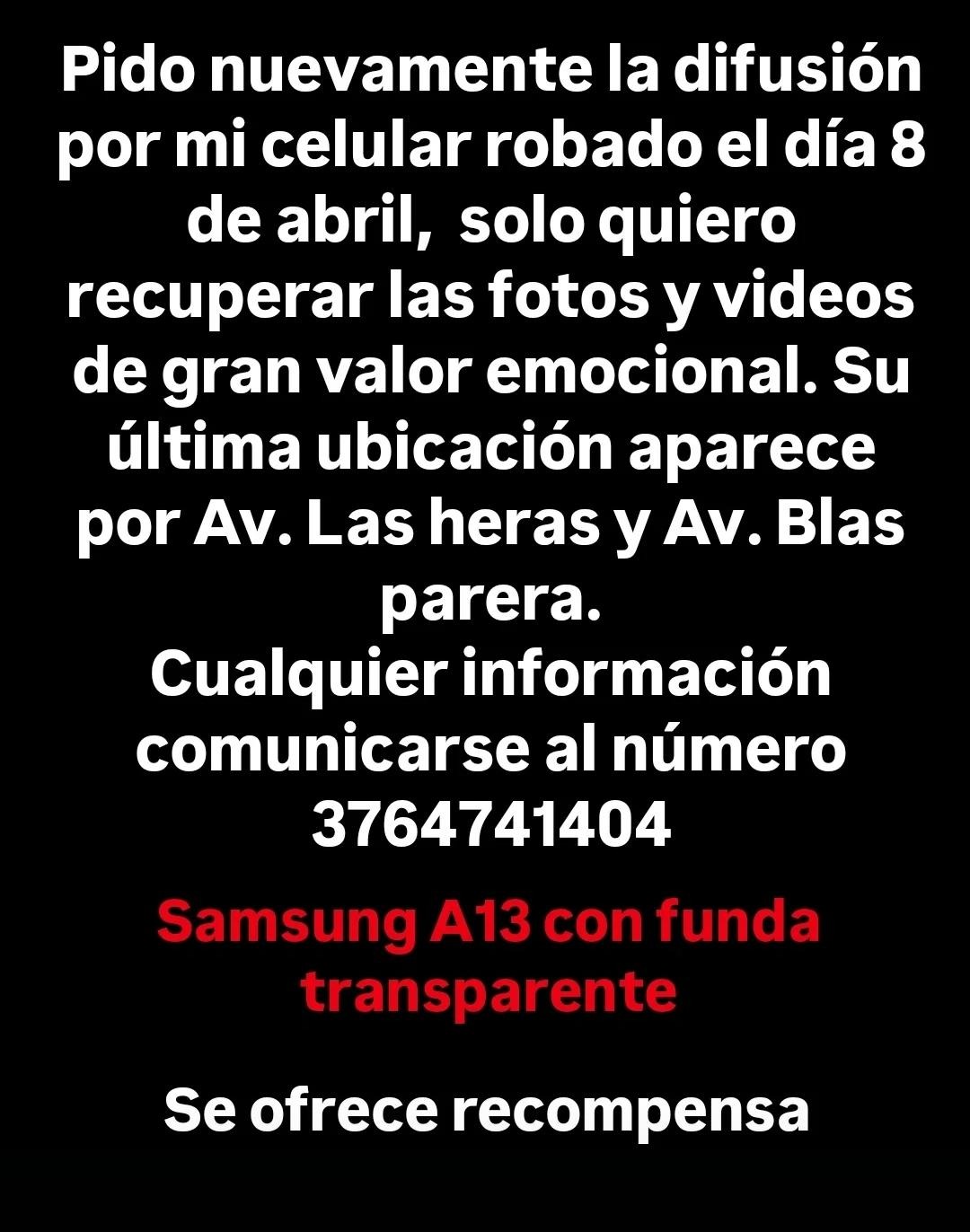 Según indicó, la última ubicación del celular se registró en la zona de las avenidas Las Heras y Blas Parera. Si bien se ofrece recompensa por información, el principal objetivo no es el equipo en sí, sino poder recuperar el material que contiene.
