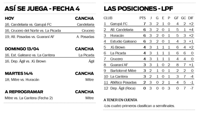 Otros juegos destacados serán los que protagonizarán los últimos finalistas Crucero del Norte vs. La Picada y el clásico entre Atlético Posadas y Guaraní Antonio Franco, a las 16 y 19, respectivamente.