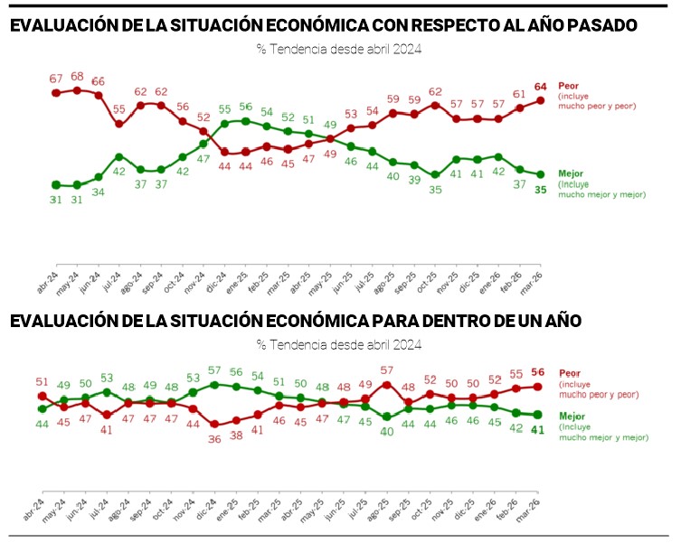 El estudio expone una convergencia clara entre tres dimensiones clave: la evaluación del presente económico, la percepción sobre la situación personal y las expectativas a futuro. En los tres casos, los números se inclinan de manera consistente hacia el terreno negativo, configurando un escenario donde el malestar deja de ser fragmentado para convertirse en mayoritario.