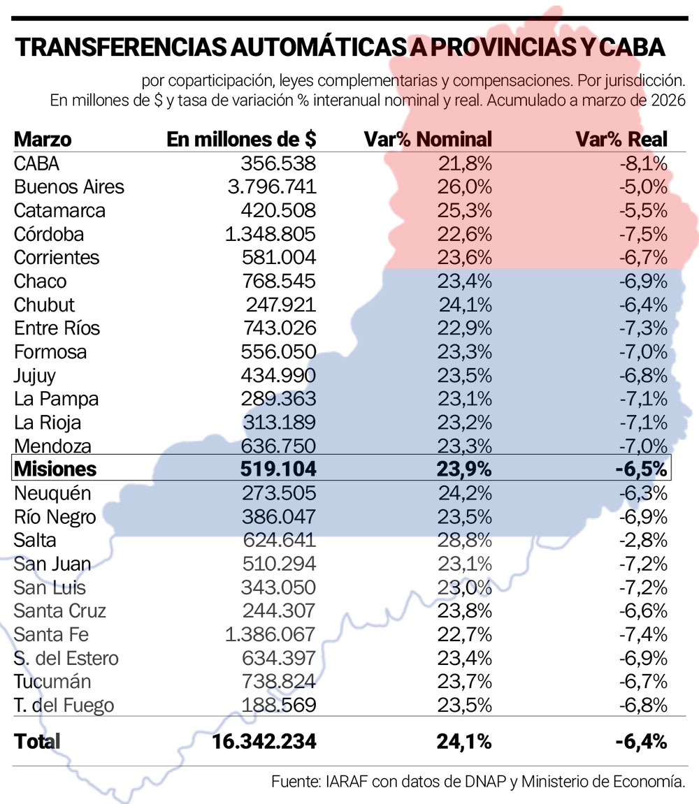 Traducido a valores, esto supone que el conjunto de las provincias dejó de percibir alrededor de $1 billón en términos reales respecto del año anterior. En el caso de Misiones, que recibió cerca de $519 mil millones en ese período, la caída real del 6,5% implica una pérdida estimada de más de $33 mil millones. Es decir, recursos que ya no ingresan al circuito provincial y que profundizan la presión sobre las cuentas públicas.