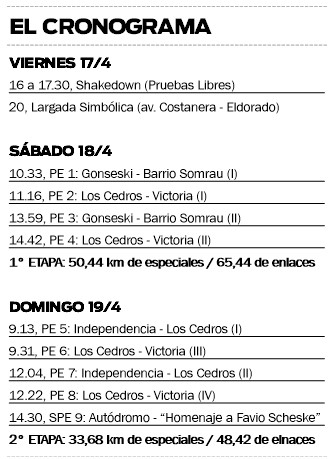 El sábado se abrirá el telón de la emoción, desde las 10.33 y con los cuatro especiales que le darán forma a la primera etapa, que tendrá más de 50 kilómetros de velocidad pura. El domingo, en tanto, habrá otros cinco especiales para la segunda etapa, entre los que se destaca el Súper Especial a realizarse en el autódromo eldoradense, en homenaje al mecánico Favio Scheske, recientemente fallecido.