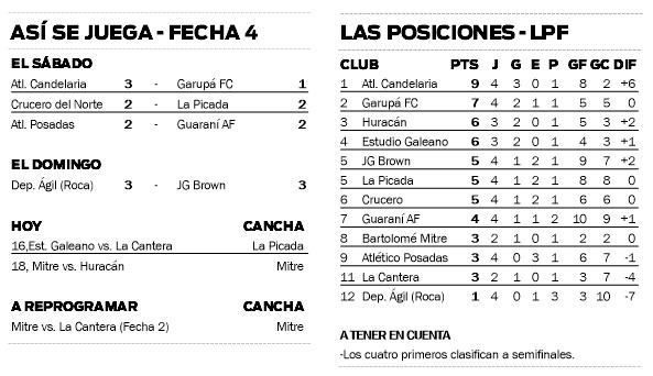 La fecha tuvo hasta el momento la victoria de Candelaria sobre Garupá por 3-1 y los empates entre Crucero – La Picada (2-2), Atlético Posadas vs. Guaraní (2-2) y Ágil vs. Brown (3-3).