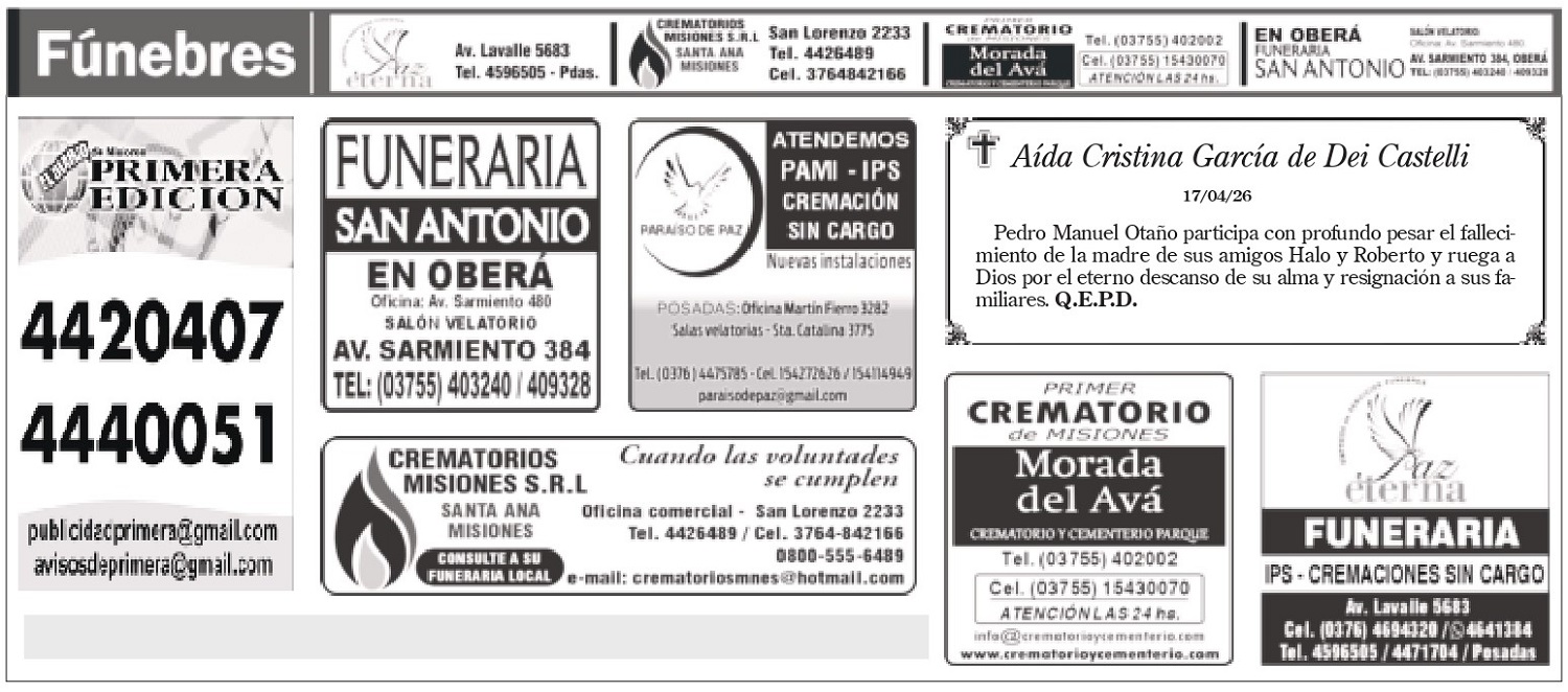 Fúnebres del viernes 17 de abril de 2026