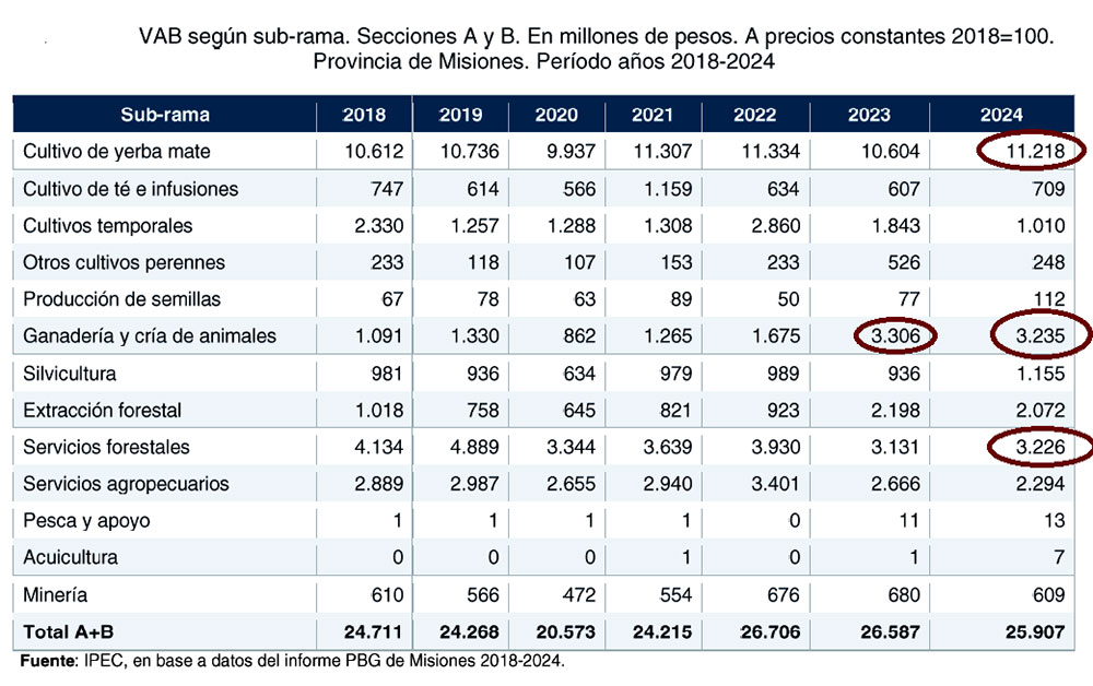 La economía de Misiones atraviesa una transformación silenciosa pero profunda. El último informe del Producto Bruto Geográfico (PBG) del Instituto Provincial de Estadística y Censos (IPEC) muestra que, aunque el agro representa apenas el 10,1% del total provincial, su estructura interna está cambiando con fuerza, impulsada por el crecimiento de la ganadería y el histórico liderazgo de la yerba mate.