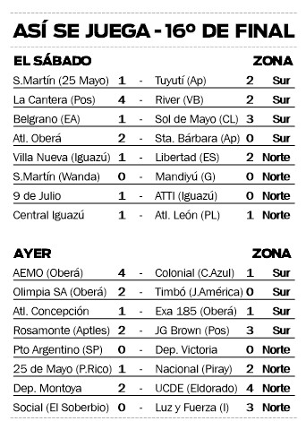 Por otro lado, en la región Sur, AEMO de Oberá superó por 4-1 a Colonial de Cerro Azul; Olimpia San Antonio de Oberá se impuso por 2-0 a Timbó de Jardín América; hubo empate entre Atlético Concepción y Ex Alumnos 185 de Oberá y Brown metió un triunfazo de visitante frente a Rosamonte de Apóstoles (3-2).