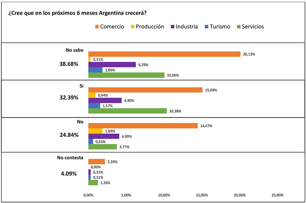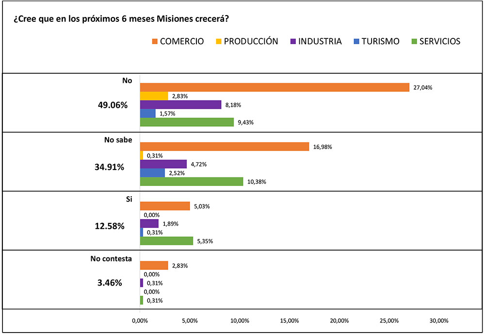 En términos de expectativas locales, el panorama es incluso más negativo. Solo el 9% de los encuestados cree que Misiones crecerá en los próximos seis meses, mientras que casi la mitad (49%) considera que no lo hará.