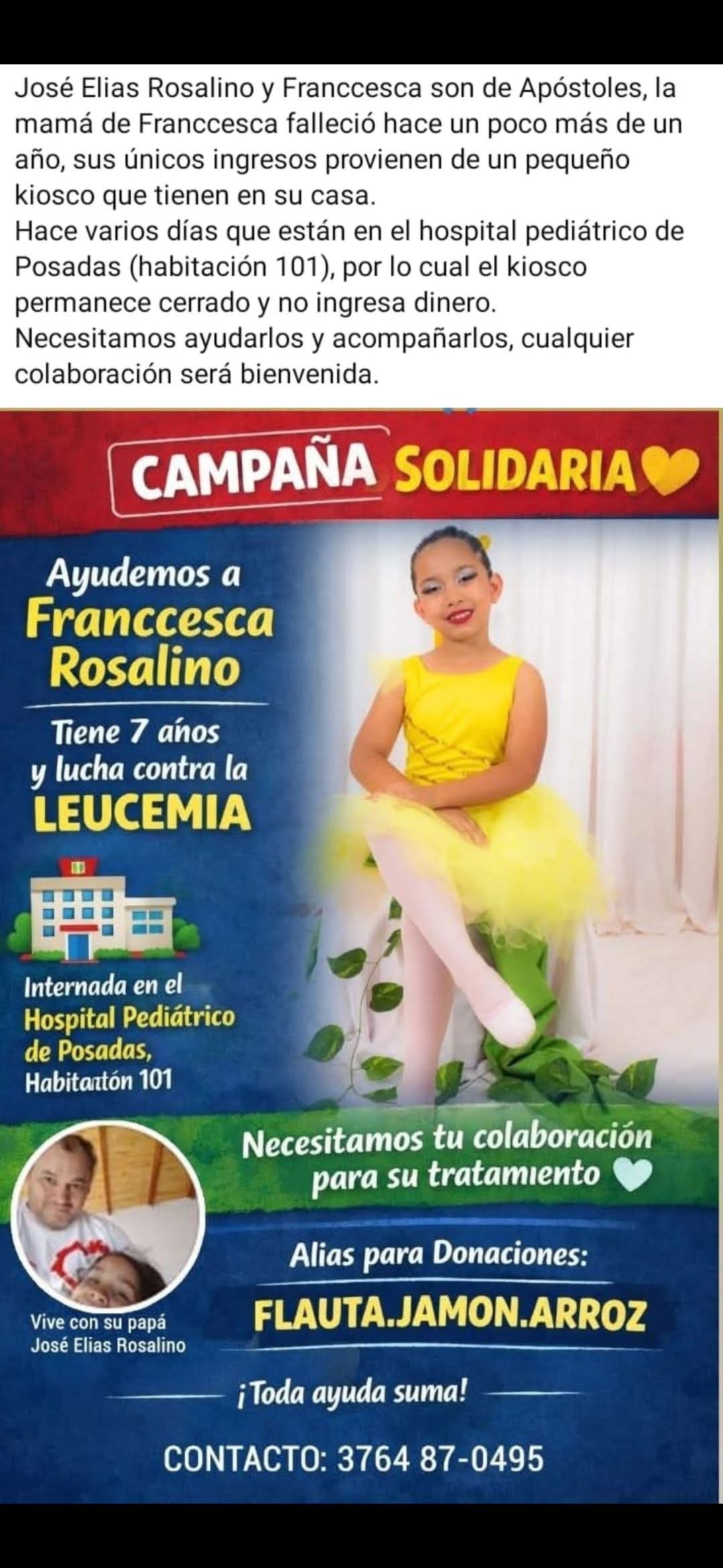 Una campaña solidaria se puso en marcha para acompañar a Franccesca Rosalino, una niña de 7 años oriunda de Apóstoles, que atraviesa un tratamiento contra la leucemia y permanece internada en el Hospital Pediátrico de Posadas, en la habitación 101.