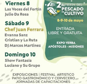 Esta semana se llevó a cabo la presentación de la II Fiesta del Pescado de Cultivo, el cual tendrá en la ciudad de Apóstoles el própximo 8, 9 y 10 de mayo. Habrá exposiciones, talleres de consumición del producto del pescado y la participación del Chef de Cocineros Argentinos, Juan Ferrara en una cocina en vivo. Desde luego show musicales destacándose Julio Da Rosa, Cristian y La Ruta, Evanna Sanz, Luciano y Su grupo y Las voces del Fortín.