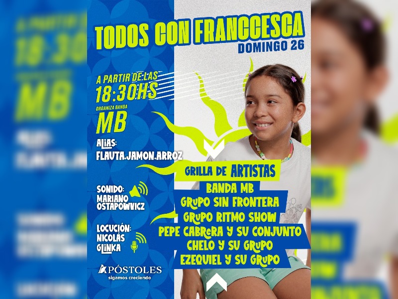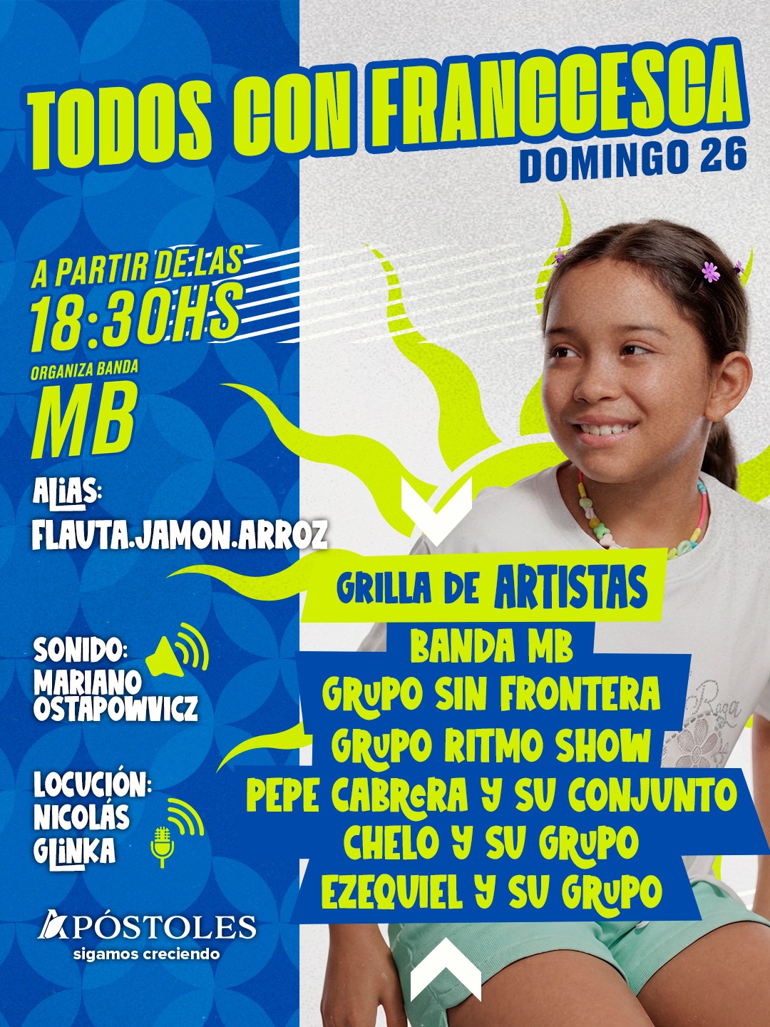 La comunidad de Apóstoles volverá a reunirse en un gesto de solidaridad este domingo 26, cuando vecinos y vecinas participen de un evento a beneficio de Franccesca, una niña de 7 años que atraviesa un tratamiento contra la leucemia. La convocatoria está prevista para las 18:30 y busca reunir ayuda económica y acompañamiento en un contexto complejo para la familia.