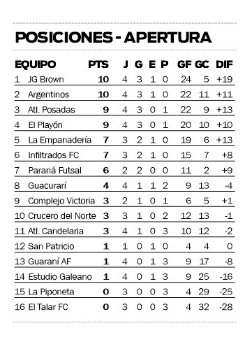 Un dato no menor es que los dos escoltas, Atlético Posadas y El Playón Futsal, perdieron terreno luego de cosechar sendas derrotas. El Decano tropezó frente a Paraná Futsal (3-2), mientras que el team de Garupá no pudo con Complejo Victoria (3-1).