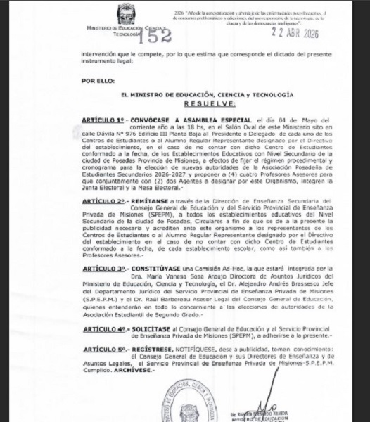 Para dicha asamblea especial se deberá acreditar mediante nota firmada por el Directivo del establecimiento Escolar ante el Ministerio de Educación, Ciencia y Tecnología a los representantes designados, como así también a los profesores asesores. Tal lo dispuesto por el Ministerio de Educación, Ciencia y Tecnología mediante Resolución N° 152/2026.