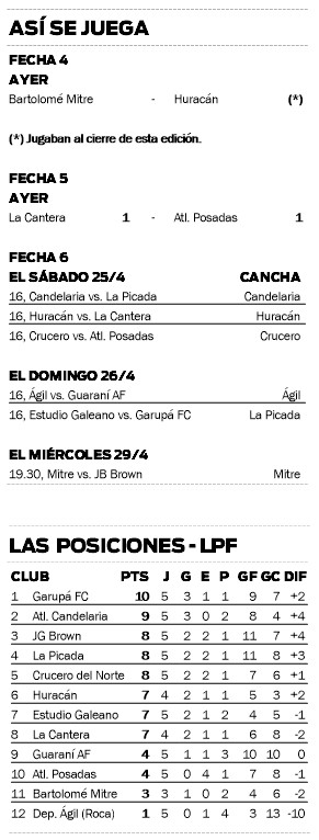 Por otro lado, la Liga Posadeña dio a conocer el fixture para el fin de semana en el que se disputará, si el clima lo permite, la sexta fecha del Torneo Apertura.