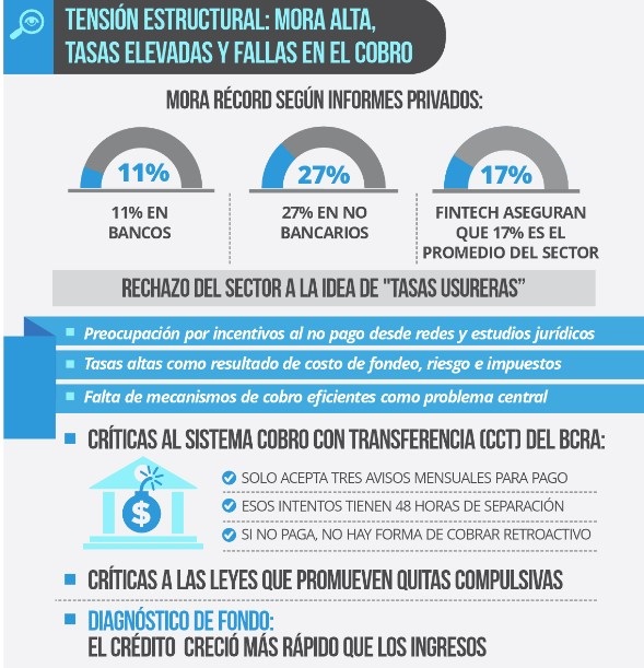 El problema estructural que identifican es que carecen de mecanismos de recaudación eficientes. El BCRA anunció el sistema de Cobro con Transferencia (CCT) con obligatoriedad recién para agosto de 2026, ya que el problema no es solo el precio del crédito sino la imposibilidad de recuperar lo prestado cuando el deudor decide no pagar.