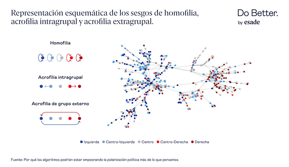 Torrens y Carrasco-Farré documentan un patrón empírico robusto en YouTube: los sistemas de recomendación no solo empujan a los usuarios hacia versiones más extremas de su propio espectro (acrofilia intragrupal), sino que también los exponen desproporcionadamente a la caricatura más intensa del lado opuesto (acrofilia extragrupal).