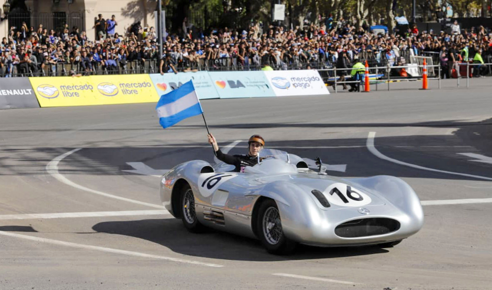 La segunda pasada hizo delirar a la gente: con las clásicas antiparras de lente dividido que usaban los corredores de mediados del siglo XX y una bandera argentina, Franco dio varias vueltas a bordo del Mercedes-Benz W196, una réplica del famoso Flecha de Plata con el que Juan Manuel Fangio ganó los campeonatos mundiales de 1954 y 1955. Resplandeciente, con dos escapes cromados asomándose por el costado derecho, llevaba el #16 en la trompa: el número que usó el quíntuple campeón mundial durante sus carreras más exitosas.