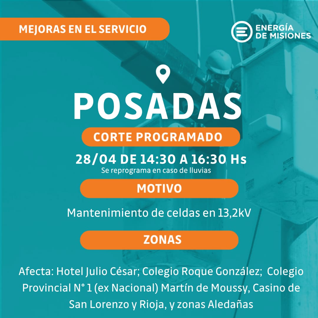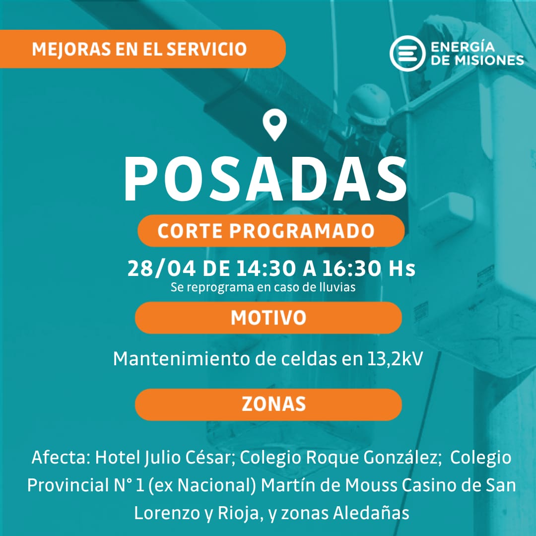 El servicio eléctrico en el centro de Posadas volverá a verse interrumpido de manera programada este martes 28, en el marco de tareas de mantenimiento destinadas a garantizar el normal funcionamiento de la red.