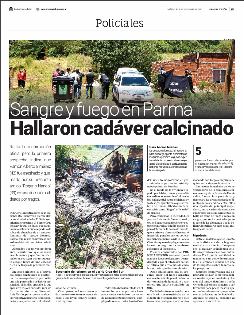 El asesinato por el que reconoció su culpa, en audiencia de visu de juicio abreviado, ocurrió durante la madrugada del martes 8 de diciembre de 2020 en el barrio Cruz del Sur en el paraje Nemesio Parma, jurisdicción zona oeste de Posadas.