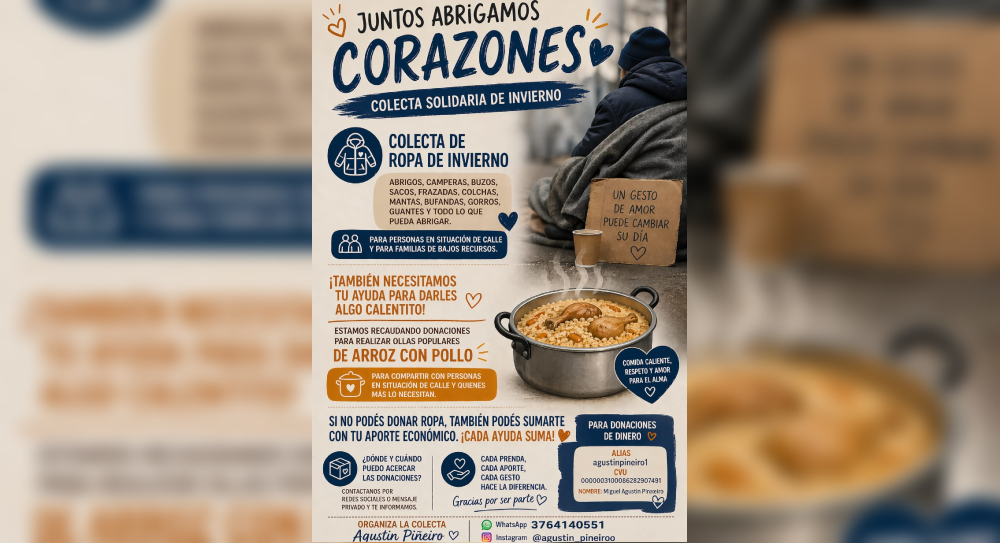 Con la llegada de las bajas temperaturas, el joven Agustín Piñeiro vuelve a apostar a la solidaridad de los posadeños y lanzó una nueva colecta de invierno con el objetivo de asistir a familias en situación de vulnerabilidad.