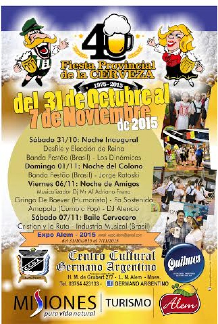Sábado 31 de Octubre:19,00 hs. desfile por Av. Belgrano desde calle Entre Rios, hacia las instalaciones del Club Germano Argentino. Seguidamente acto inaugural con presencia de autoridades locales y provinciales, espiche del barril de chop.  Elección de la Reina Provincial de la Cerveza, con la presencia de las Reinas Provinciales consagradas. Bailamos con el ritmo de Banda Festao de Brasil y Grupo Los Dinámicos Leandro N. Alem.Entrada Libre hasta las 21 hs. – Servicio de restaurante y comidas rápidas. Domingo 1 de Noviembre:18 hs. Gran Baile del Colono, festejamos con todos los trabajadores de nuestra tierra, dedicado enteramente para nuestros colonos a fin de que luego de este año de trabajo y sacrificio puedan celebrar su labor junto a esta fiesta que creció junto con ellos.Bailamos con el ritmo de Banda Festao de Brasil y Jorge Ratoski de L. N. Alem.Entrada Libre hasta las 21 hs.  – Servicio de Restaurante y comidas rápidas. Lunes 2 de Noviembre:Charla informativa sobre donación de sangre voluntaria y donación de medula ósea. 20 Hs. Trabajo en conjunto con el Banco de Sangre de la Provincia de Misiones.- Martes 3 de Noviembre:18 Hs. Tarde de los niños, presentación del Programa “Gurises Felices”, dedicado a todos los niños de las escuelas primarias de Leandro N. Alem, y la zona.El ingreso es gratuito para todos. Servicio de comidas rápidas.- Miércoles 4 de Noviembre:19,30 Hs. Presentación de distintos ballets o cuerpos de baile de nuestra ciudad y localidades vecinas, juntamente con escuelas deportivas. Elección de Miss Alegría 2015, entre niñas de 6 a 10 años, quienes podrán inscribirse esa misma jornada desde el horario de apertura.Ingreso Libre.  Servicio de Restaurante y comidas rápidas. Jueves 5 de Noviembre:Extracción de sangre. Trabajo en conjunto con el Banco de Sangre de la Provincia de Misiones. De 9.00 hs a 20.00 hs.-Misa en acción de Gracias por los 55 años del Centro Cultural Germano Argentino y los 40 años de la Fiesta Provincial de la Cerveza. 20.00 hs. en la Parroquia Santa Teresita del Niño Jesús.- Viernes 6 de Noviembre:22 hs. El Sabor del Encuentro. Noche de amistad y de la juventud. Veni con tu grupo de peña y amigos a disfrutar de un show de humor con el “Gringo” Fernando De Boever – Música de todos los tiempos con Banda Fa Sostenido de L. N. Alem –E iniciando la noche de la juventud, presentación del GRUPO AMAPOLA (Cumbia Pop) y al finalizar toda la música del DJ Guillermo Atencio Posadas -Servicio de Restaurante y Comidas Rápidas. (Venta de entradas anticipadas, y tarjetas con cena incluida).- Sábado 7 de Noviembre:22 Hs. Noche de Cierre con un gran Baile Cervecero, con la animación de Cristian Wagner y la Ruta de L. N. Alem e Industria Musical de Brasil, quienes realizarán un show especial por los 40 años de la fiesta con todos los ritmos que a lo largo de estos años se escucharon y bailaron en la Fiesta Provincial de la Cerveza.Entradas Anticipadas y en Boletería – Servicio de Restaurante y Comidas Rápidas.