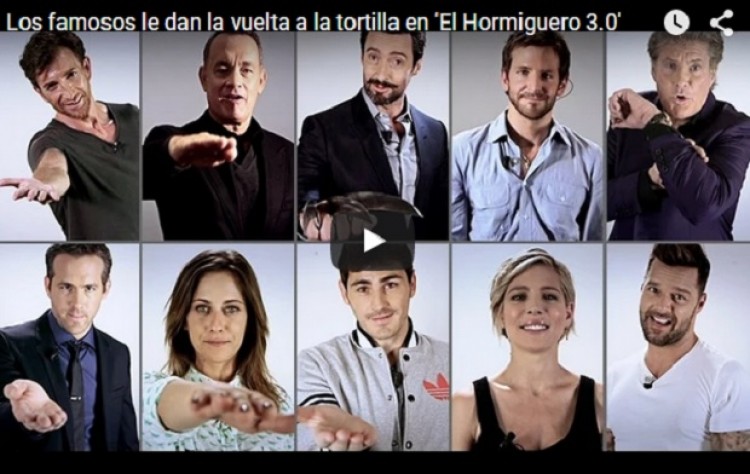 Con Antonio Banderas, Ricky Martin, Alejandro Sanz, Laura Pausini, Iker Casillas, Hugh Jackman, Elsa Pataky, Tom Hanks, Marta Sanchez, Enrique iglesias, Gloria Estefan, Mario Casas, Ryan Reynolds, Backstreet Boys, Mónica Naranjo, Karlos Arguiñano, Dani Martín, Diego Cigala, los hermanos María y Paco León son algunos de los casi 70 famosos que forman parte del video: “Dale la vuelta a la tortilla”, creado en septiembre de 2014 y que ahora hace furor en Facebook. El programa de televisión español El Hormiguero, de la cadena Antena 3, tuvo de invitados a todas las celebridades internacionales que aparecen en el video.El presentador Pablo Motos había dicho a la prensa que ideó la canción “Dale la vuelta a la tortilla” para animar a la gente de España a ser positivos y para ver la vida con un poco más de optimismo tras seis años de crisis económica, según publicó el portal Huffington Post. El programa es uno de los favoritos de los españoles y principalmente dicen que es porque pasaron estrellas de cine quienes gracias a su conductor se sienten bien, se divierten y quieren volver. Los famosos “lo pasen bien, haciendo cosas divertidas que les sorprenden. El resultado es impresionante. Los invitados se relajan, disfrutan y lo que hubiera sido una entrevista aburrida se convierte en un fantástico programa que divierte a todo el mundo”, explicó un fan seguidor.PRIMERA EDICIÓN Web lo comparte con ustedes para que todos le “Demos vuelta a la tortilla”: