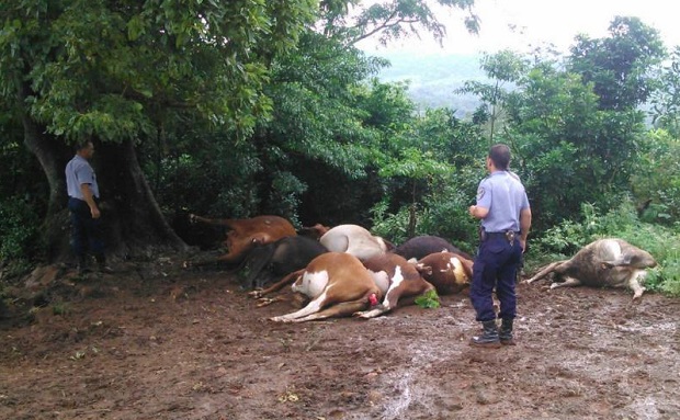 Un rayo fulminó a un joven de 22 años en el paraje Las Limas, ubicada en el municipio de Colonia Aurora, camino a Colonia Alicia. En la misma zona, las descargas eléctricas producto de la tormenta mataron también a once vacas que descansaban bajo a un árbol.El insólito incidente se produjo este jueves alrededor de las 8:00 y provocó el fallecimiento fulminante del joven, identificado como Francisco Olivera, quien ingresó al hospital local ya sin signos vitales, según informaron desde la Unidad Regional XI de la Policía, con asiento en Aristóbulo del Valle. Fuentes de esa dependencia explicaron -a partir de testimonios de familiares- que al momento del hecho la víctima se hallaba durmiendo en su casa, en un colchón sobre el piso de tablas en cercanías de la cocina.Una vez en el hospital, el medico de turno certificó que sufrió "paro cardiorrespiratorio debido a descarga eléctrica (rayo)".Paralelamente, este jueves por la mañana se hizo presente en la comisaría de Colonia Aurora el ciudadano Anibaldo H., de 41 años, domiciliado en el Kilómetro 20 del paraje Las Limas, quien radicó una exposición por la muerte de once de sus animales vacunos debido a descargas eléctricas por el temporal. Según él, los ejemplares damnificados se hallaban debajo de una planta de palta, en el potrero en cercanías de su vivienda. Por el infortunado hecho, el ciudadano calculó una pérdida económica aproximada de 100 mil pesos.Fotos: Gentileza Juan Melo (FM Capital de San Vicente)