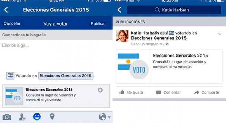 Según se informó oficialmente, durante el próximo domingo cada usuario verá en su página un mensaje que les recordará que "es el día de las elecciones" y un pequeño botón con forma de megáfono para compartir con amigos el anuncio "Yo voté".El megáfono permitirá además acceder a la página de la Cámara Nacional Electoral para consultar el lugar de votación.Según informó Facebook, desde el inicio de la campaña esa red social registró más de 102 millones de interacciones sobre las elecciones, convirtiéndose en uno de los mayores debates políticos online de América Latina.Fuente: Agencia de Noticias NA