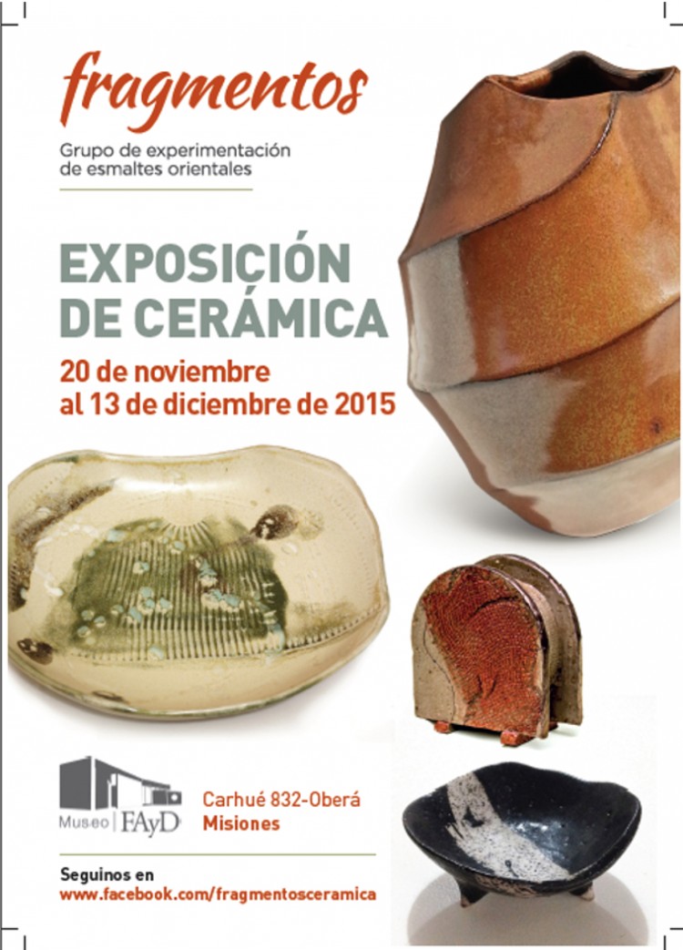 El grupo Fragmentos, fundado el 4 de noviembre de 2013, está integrado por Pablo D. Domínguez, Jorge Nabel, Alejandra Rivero, Fernando López, Victoria Drisaldi, Francisco Buitrago, Verónica G. Kuwota, Maximiliano Abbiati, Cristina Iafigliola, Leonardo Carbone, Kyong Woo Im, Sebastián Hernández, Tokio y Tokiko Oghane, Leila Córdoba, Ariel Walter, Nicolás Rendtorff, Jana Pucciarelli, Carolina Junio, Silvia Virginia Jordán, Ricardo Luza, Laura Wagemans, Pilar Ayerza y Verónica Sebben.“Lo que nos define como grupo quizás sea el hecho de que, desde un lugar inconsciente, hemos estado buscando la mano, la opinión de otro que nos acompañe… y eso es lo que somos como Fragmentos, esa mirada que acompaña en el camino.” El viernes 20 será la inauguración, a las 17, algunos integrantes de Fragmentos realizarán una demostración, para toda la comunidad, en la sala de cerámica de la Facultad de Arte y Diseño de Oberá, en Carhué 832.La exposición se podrá visitar hasta el día 13 de diciembre, de martes a viernes de 9 a 12 y de 16 a 20 y los sábados de 16 a 20 en Tinogasta y Racuh, Oberá, con entrada libre y gratuita. Para realizar visitas escolares, comunicarse con la Secretaría de extensión de la Facultad de Arte y Diseño al teléfono: 03755- 401150, interno 109.