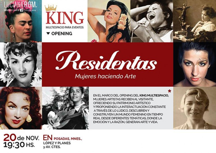 Residentas propone a sus visitantes (público) una gran situación de provocación, participación e improvisación a través de manifestaciones artísticas multidisciplinarias.Estarán a cargo de mujeres que cultivan y hacen a la cultura. Mediante lo lúdico, ellas descubren y construyen un mundo femenino en tiempo real, donde la emoción y la razón generan arte y vida.El evento será una muestra en la que más de cincuenta artistas presentarán sus trabajos desde diferentes temáticas y en diversas áreas como audiovisuales, fotografía, pintura, instalaciones, música en vivo, Djs sets, Vj sets, performance teatral, danzas, baile, make up en vivo, peinados, asesoramiento de imagen, ambientación, intervenciones, diseño de indumentaria, gastronomía, diseño gráfico y literatura.Esta es una puesta súper novedosa de alta creatividad con espacios especiales en cada uno de los salones King Multiespacios en la avenida Corrientes y López y Planes, el próximo 20 de noviembre a las 19.30.