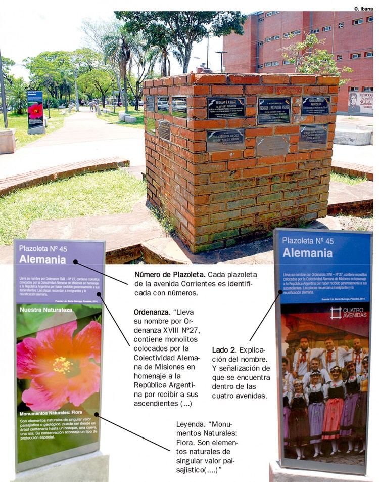 Desde mediados de noviembre las plazoletas de avenida Corrientes exhiben láminas con números que las diferencian. Pero principalmente, las placas dejan ver imágenes de importante magnitud y colores vivos. Con leyendas que documentan porqué llevan determinado nombre, motivo y ordenanza. El trayecto aporta información histórica y permite al ciudadano realizar una interpretación sobre el fundamento y la finalidad que tienen los monumentos dentro del espacio verde. Las placas surgen poco después del informe realizado por PRIMERA EDICIÓN a fines de octubre, cuando este medio llevó adelante una extensa recorrida por las plazas que se encuentran dentro de las cuatro avenidas. En ese itinerario se contabilizaron 57 esculturas, en su mayoría sin placas, dejando en evidencia que de ese modo no permitían obtener información para comprender los orígenes de cada monumento. Y principalmente, porque gran parte de esos monolitos son desconocidos por la mayoría de los misioneros. Actualmente, el peatón cuando camine por las plazas de la Corrientes encontrará láminas de más de un metro de alto que le contarán, al paso, un relato de nuestra historia. Resta aún que similar recorrido se aplique en las demás avenidas que circunvalan el casco céntrico o histórico de Posadas. En la plazoleta de AlmeidaSi nos ubicamos en las avenidas Corrientes y Mitre nos encontramos con la plazoleta 44, en conmemoración a Aparicio Pereyra Almeida, primer gobernador del Territorio Nacional de Misiones, desde 1946 a 1949.La ordenanza 27 le asigna su nombre y la importancia de su memoria. En esa misma lámina se menciona el rol e importancia de los espacios públicos, el cual es “propiciar el encuentro, la recreación, el bienestar social, la identificación del ciudadano y la integración del rol biológico y social”. Esculturas de las cuatro avenidasEn general, la mayoría de las esculturas de las plazas datan de 1930 en adelante, ubicadas preferentemente sobre Mitre y Roque Sáenz Peña. Sin olvidar que en la plazoleta Andresito Guacurarí de la Roque Pérez, permanecen las columnas que pertenecen a la Misión Jesuítica de Santa Ana del año 1615 aproximadamente. Las mismas se repatriaron hace más de 40 años desde Buenos Aires y hasta hoy generan la discusión de si deben ser regresadas a su lugar de origen.Al caminar las avenidas, los monumentos hablan su historia. Algunos tan contemporáneos, evocan grandes fatalidades como la vivida en enero de 2010, en la 80º Edición del Cruce del Paraná.