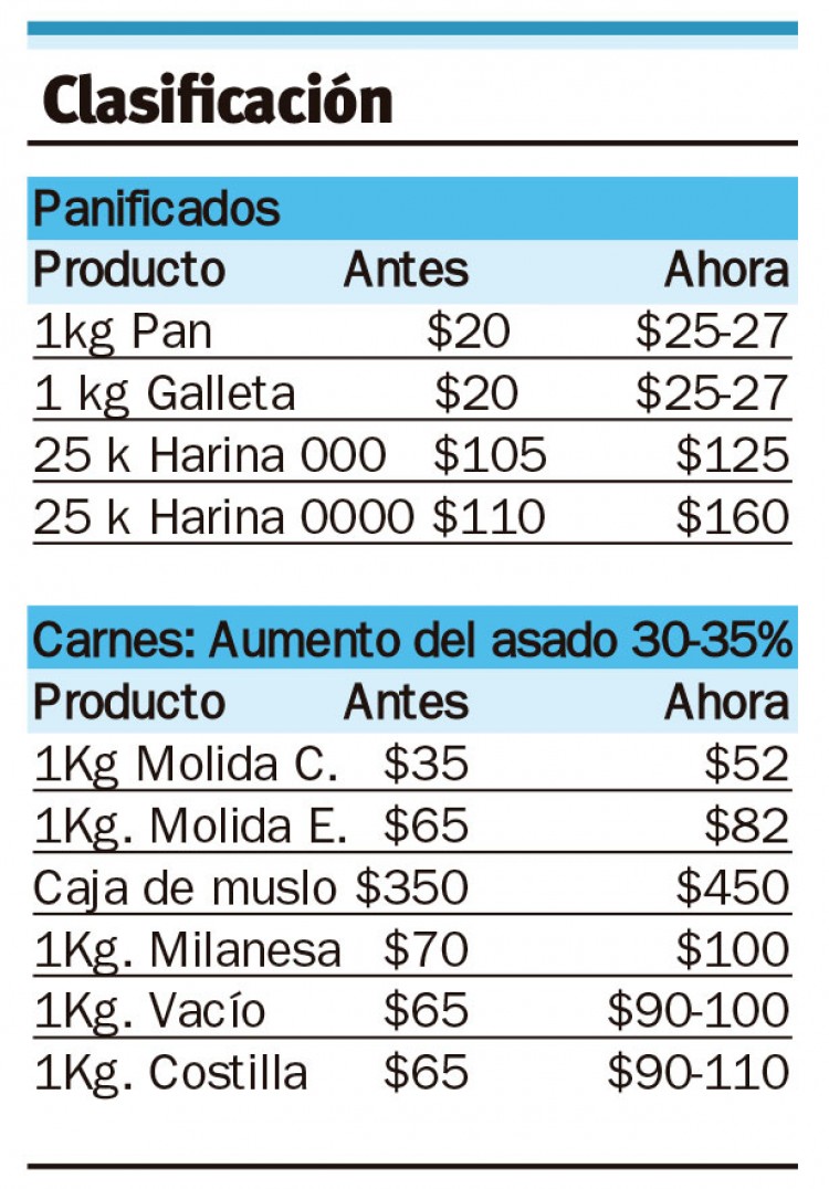 Luego del incremento en productos básicos, la remarcación de los precios marchó entre este fin de semana y el martes en la harina, cuyo aumento fue de un 100%, y en la carne, con un incremento que se estima ronda entre un 20 y 25%, de acuerdo a quienes trabajan en esos rubros."Hoy la bolsa de harina está costando entre 400 y 420, antes estaba en 220 o 240, es decir, aumentó en un 100%", precisó María Rosa Villalba, secretaria general del Sindicato de Panaderos.Como consecuencia, "entre el lunes y hoy (por el martes) hubo un incremento del 25% en los productos panificados y un 20% en las especialidades de las panaderías" precisó Villalba. Y siguió "el kilo de pan estaba alrededor de 20 pesos y subió a 25 o 27, depende de la zona. Pero en la semana calculamos que todos van a tener el mismo precio. Suponemos que no habrá nuevos aumentos, que se mantendrá ya que fue una suba del 100%. Son aumentos incontrolables, no sólo de la harina sino de los productos alimenticios en general y el transporte. Y todo lo sufre el consumidor".En el sector de la carne se registró un aumento del 20 y 25% en los últimos diez días. "Dos meses atrás la carne molida común costaba 35 pesos hoy (por ayer) subió a 52. Y la especial pasó de 65 a 82 pesos", especificó Raúl Betancourt de abasto El Corral. Y avecinó que se viene otra corrección de precios: "Esperemos que no siga aumentando. Sin embargo, nuestros abastecedores señalan que habría más aumentos. Es tremendo, estamos hablando de artículos de primera necesidad". Doroteo Sosa, secretario general del Sindicato de la carne, explicó que los aumentos fueron constantes durante todo el año. Sin embargo, desde hace unos quince días "se dieron aumentos importantes. Son aumentos del 25%, pasó todos los porcentajes que se lograron en las paritarias de abril. Afecta a todos los sectores porque los aumentos de la carne no se trasladaron a los salarios".De esta forma, el kilo de asado aumentó en un 30 o 35%. El vacío, pasará a costar en las carnicerías unos 100-105 por kilo. Siguiendo a Sosa, otro valor de referencia es el kilo de la milanesa que de 70 pasó a 100 pesos. Debido a los reiterados aumentos, Sosa adelantó que en la semana se hará una reunión en el Sindicato de la carne. "Una reunión urgente para equilibrar los precios un poco".Harina, para paliar la situaciónEn dialogó con PRIMERA EDICIÓN, el presidente de la Cooperativa de Almaceneros de Posadas, Ismael Ortigoza señaló que en la mañana del martes se vivió un día "caótico". "Ver el precio de la harina en paquete que estábamos comercializando a 5 pesos subir a 7,50, otros lo tendrán a 9 pesos, nos sorprendió. La harina 000 de 25 kilos pasó de 105 a 125 pesos y la harina 0000 de 25 kilos de 110 subió a 160 pesos. Mucha gente compra para vender pan y se rebusca con esa harina. Afecta a los sectores más humildes. El tema de la harina es caótico". Ortigoza puntualizó que si bien la carne tuvo un aumento, no fue tan elevado como el incremento de la harina que es "la mano derecha de la gente que compra y se las rebusca". Para el presidente de la Cooperativa de Almaceneros de Posadas, "hoy (por el martes) subió la harina. Y si bien los demás productos se mantienen, si la harina subió pasará lo mismo con los demás productos. Ahora me preguntó ¿por qué? ¿cuál es el motivo? Y me dicen que subió porque subió. Desde mi visión fue un incremento de un 60%".Por otro lado, adelantó que actualmente la canasta con productos básicos que costaba 54 pesos tendrá un aumento mínimo "de unos cuatro pesos. Recomendamos que no compren cuando se registran aumentos elevados o que busquen marcas distintas, más económicas, hay muchos avivados y en la desesperación uno compra".