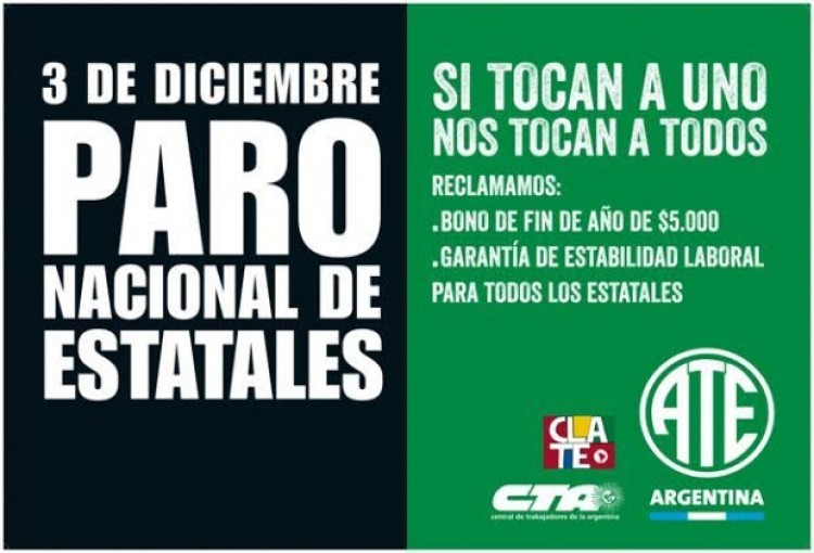 En el marco de una actividad de alcance nacional de la Asociación de Trabajadores del Estado (ATE) en reclamo por la estabilidad laboral para los más 90 mil trabajadores precarizados en el Estado nacional, el gremio en Misiones se suma a la consigna central con una movida que incluye la convocatoria a un paro en todas las dependencias públicas provinciales, municipales y nacionales y la realización de una actividad en el aeropuerto de Posadas en horas de la mañana. “A la consigna nacional, le sumamos el pedido de una recomposición salarial para los trabajadores de nuestra provincia y la demanda de un bono de fin de año que debe ser de al menos 5.000 pesos, para que los trabajadores puedan hacer frente a la escalada de precios a la que estamos asistiendo y que condicionan seriamente las economías familiares de los trabajadores”, indicó Cesar Fariña, secretario general de ATE Misiones.Desde ATE nacional, informaron que en las primeras horas del jueves, trabajadores de todos los organismos estatales del país llevarán adelante un paro de actividades en reclamo “tanto al Gobierno saliente como al entrante” para que se defina la estabilidad laboral para los casi 90.000 trabajadores que cumplen funciones en el estado Nacional bajo condiciones de precariedad laboral.La secretaria de Organización nacional, Silvia León, explicó que para la actividad, además del paro, habrá varias modalidades de protesta como radios abiertas, asambleas informativas en los sectores de trabajo y marchas en capitales de provincias. León subraya que “de los casi 90 mil precarizados, unos 66 mil son trabajadores con contratos temporales y otros 22 mil que cumplen funciones mediante lo que nuestra organización llama el estado oculto, es decir realizan tareas para el Estado a través de la tercerización del servicio a fundaciones o como becarios”.ATE entiende que se trata de un universo muy importante de trabajadores y que indistintamente sea la administración saliente de Cristina Kirchner o su sucesor Mauricio Macri “debe darse una respuesta que materialice el ingreso a planta de los compañeros”. Asimismo, ante la suba creciente de la inflación, que ha generado sólo después de las elecciones de 22 de noviembre subas de hasta el 25% en numerosos productos de primera necesidad, ATE reclama un bono de fin de año de 5.000 pesos que “ayude a atenuar la pérdida del poder adquisitivo que vienen teniendo nuestros salarios”.